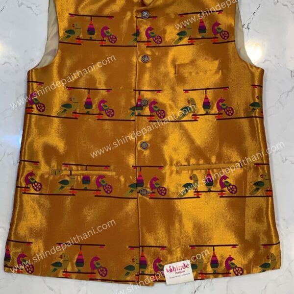 - Fabric & Color: It is crafted from Gold Silk, providing a deep, opulent luster that is central to Paithani textiles. The use of silk gives the waistcoat a superior texture, shine, and drape. The “Gold” color emphasizes a rich, celebratory, and formal aesthetic.