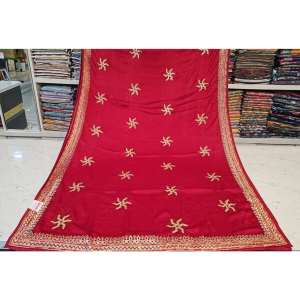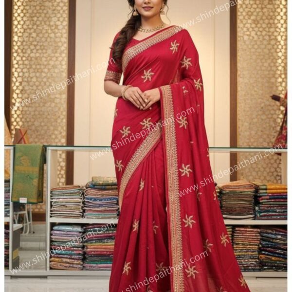 Traditional Red Silk Designer Saree with Gold Embroidered Star Motifs, Decorative Border, Ethnic Indian Wedding Wear Code – 10498