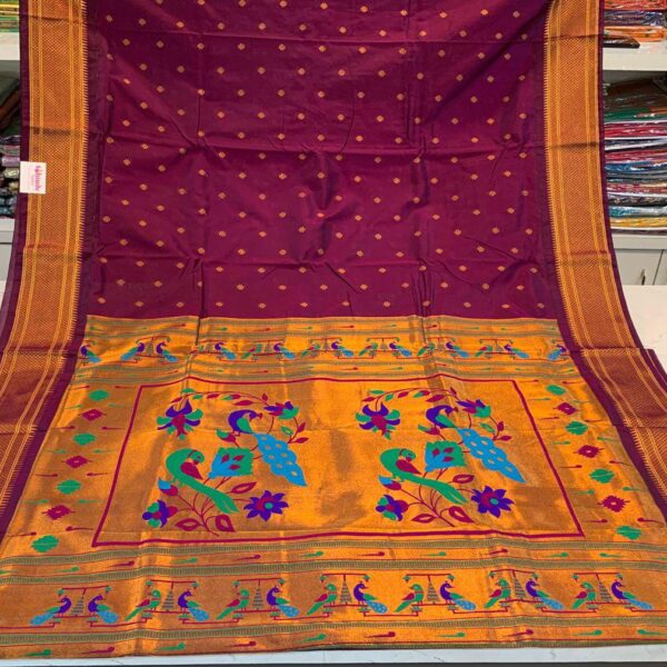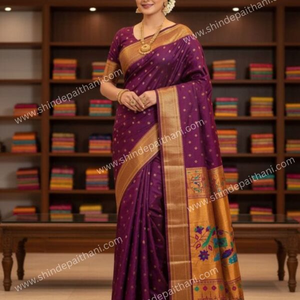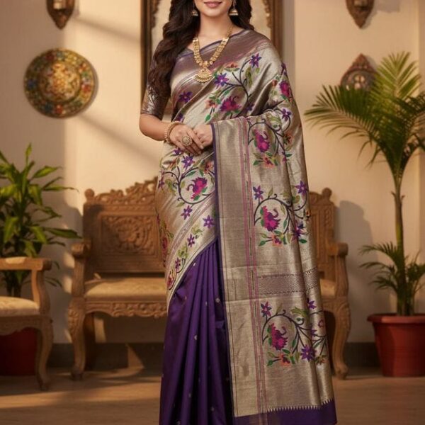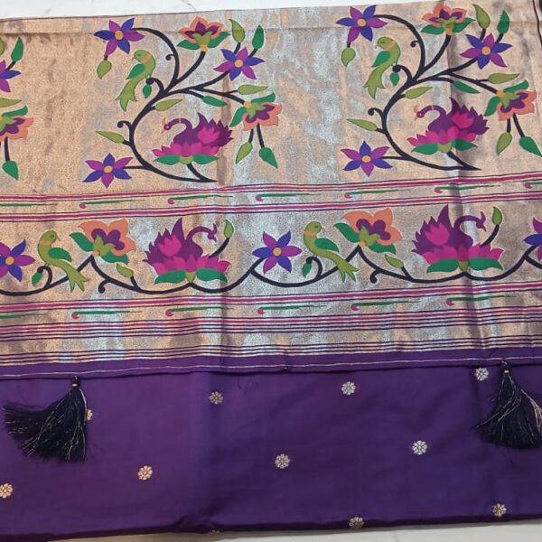 Traditional Paithani Silk Saree, Purple and Orange, Floral Peacock Border Design, Zari Work Code – 10922