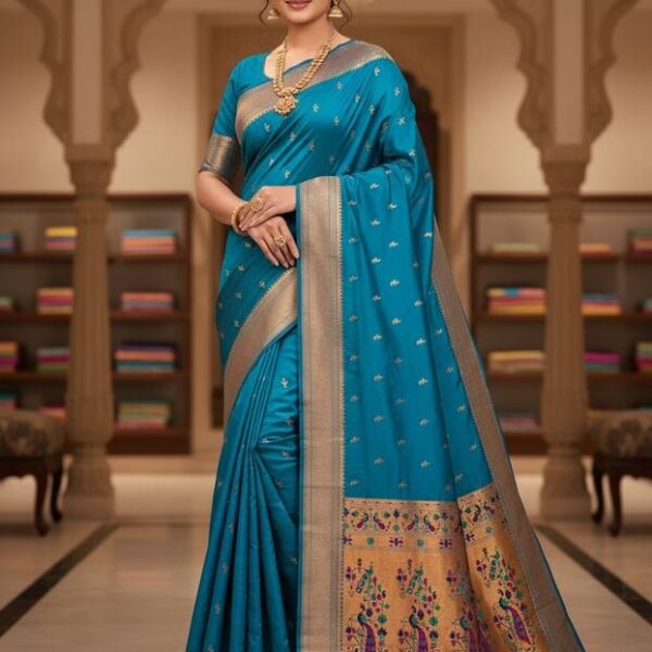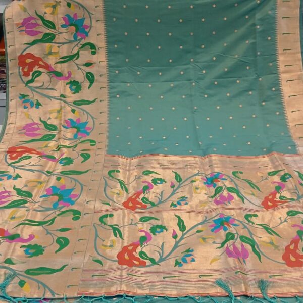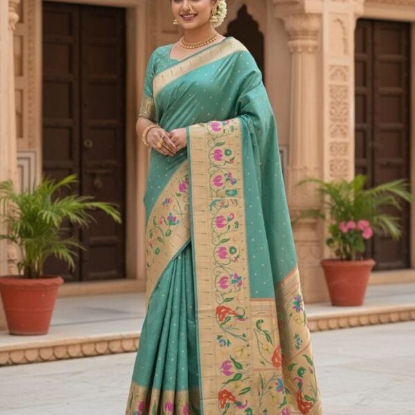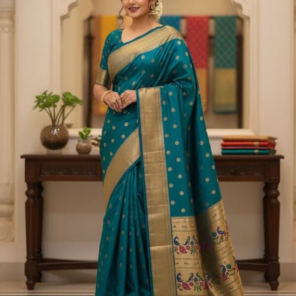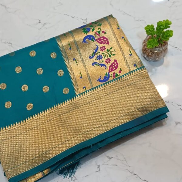 Traditional Teal Silk Saree with Gold Border and Polka Dot Pattern, Semi Paithani Style, Wedding Wear Code -10895