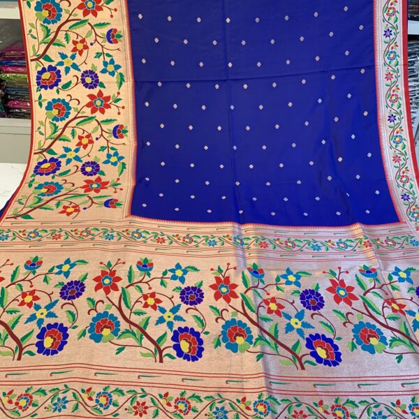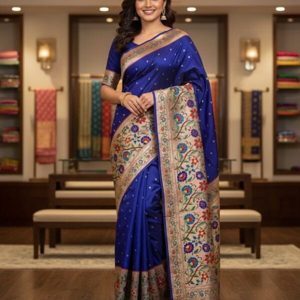 Traditional Pure Silk Paithani Saree, Royal Blue with Gold Border, Floral Embroidered Pattern, Decorative Tassels, Designer Wedding Wear Code-11492 –