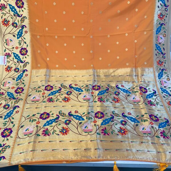Traditional Pure Silk Paithani Saree Orange with Floral Embroidered Border, Golden Zari Work, Peacock Design, Tassels, Wedding Wear Code – 11493
