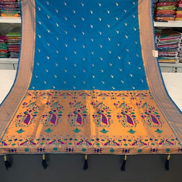 Traditional Chandrakor Paithani Silk Saree, Blue and Gold, Peacock Motif Border, Tassels, Zari Work, Wedding Wear