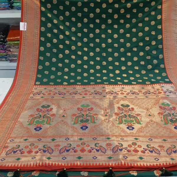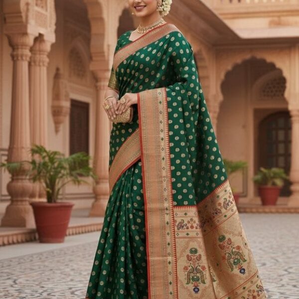 Traditional Silk Saree in Emerald Green with Gold Polka Dots, Zari Border, Wedding Wear