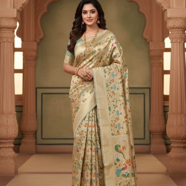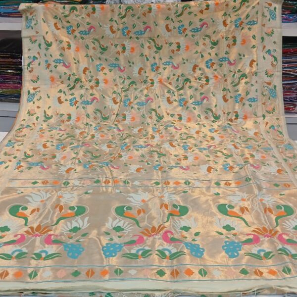 Traditional All Over Paithani Silk Saree in Beige with Floral Peacock Design,Powerloom Zari Border, Wedding Wear Code – 10847