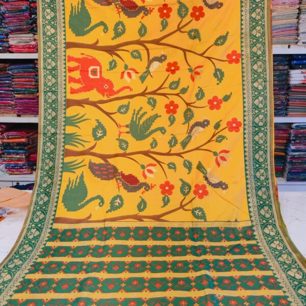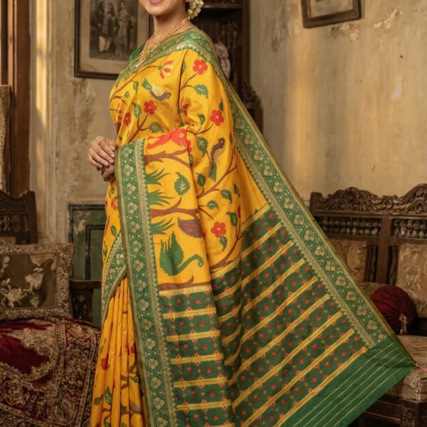 Yellow Patola Saree with Green Border, Floral Embroidery, Traditional Wear