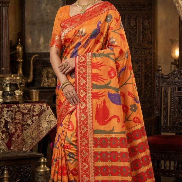 Orange Patola Saree with Floral Motifs, Red Border, Traditional Weave