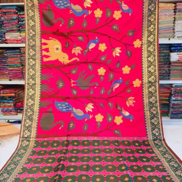 Pink Patola Silk Saree with Green Border, Floral Peacock Design