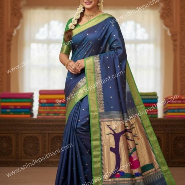 Traditional Pure Cotton Handloom Paithani Saree with Zari Border, Navy Blue and Green, Handloom Woven, Ethnic Wedding Wear