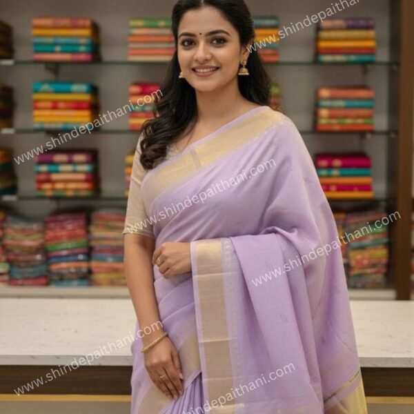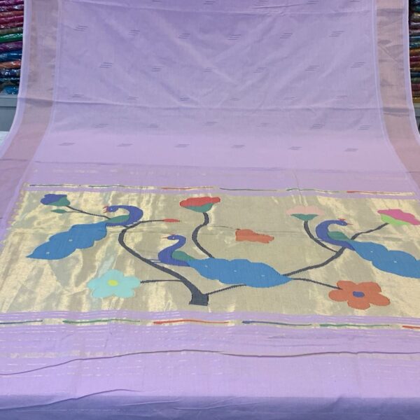 Elegant Lavender Pure Cotton Paithani Saree with Golden Border, Traditional Indian Ethnic Wear, Handloom Weave