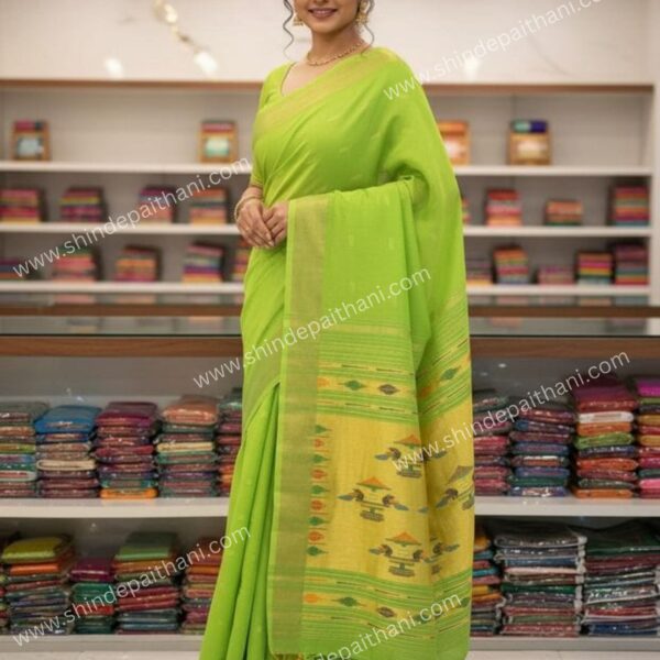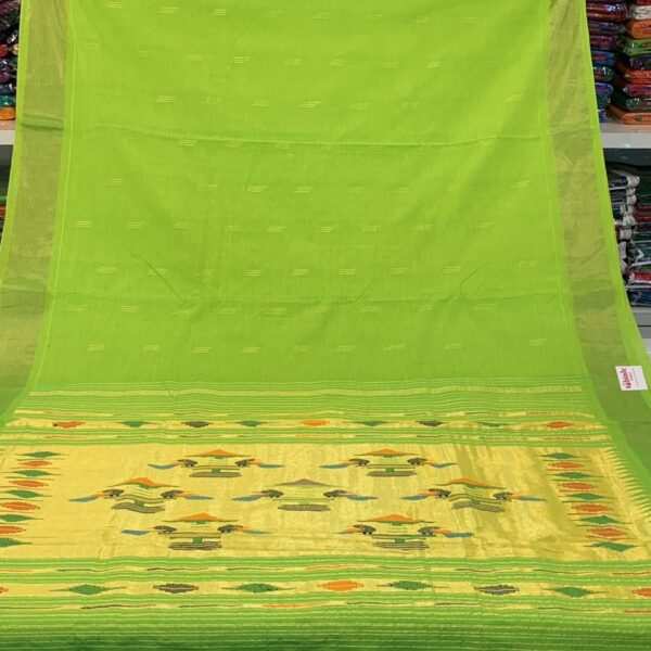 Traditional Indian Pure Cotton Paithani Saree, Lime Green with Golden Border, Handwoven Design Pattern, Ethnic Wear