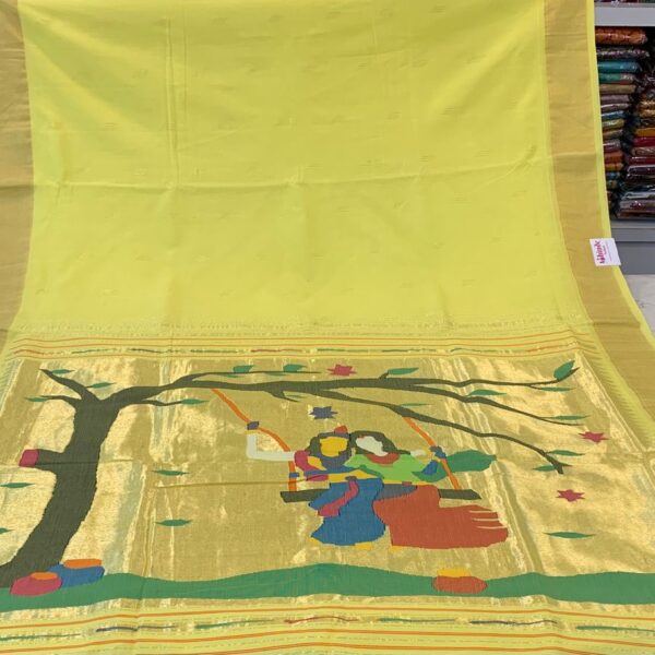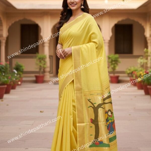 Handwoven Yellow Pure Cotton Paithani Saree with Traditional Tree Design, Elegant Pallu Border, Festival Wear for Women