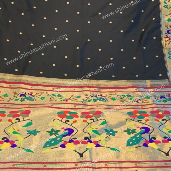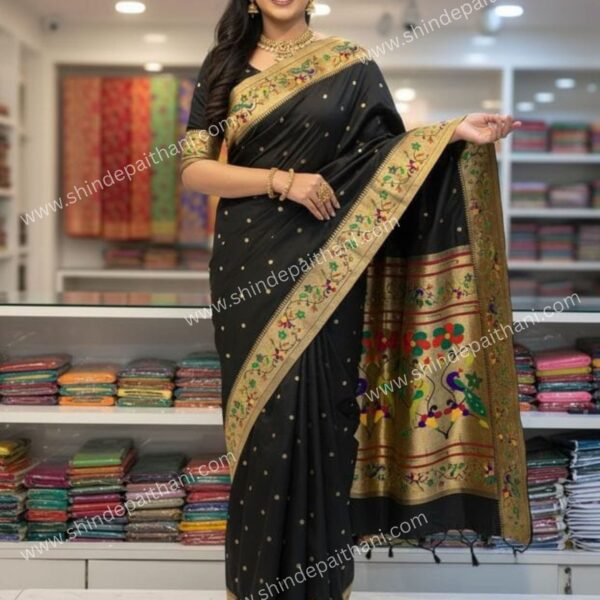 Traditional Black Silk Paithani Saree with Golden Border, Floral Embroidered Design, Wedding Wear