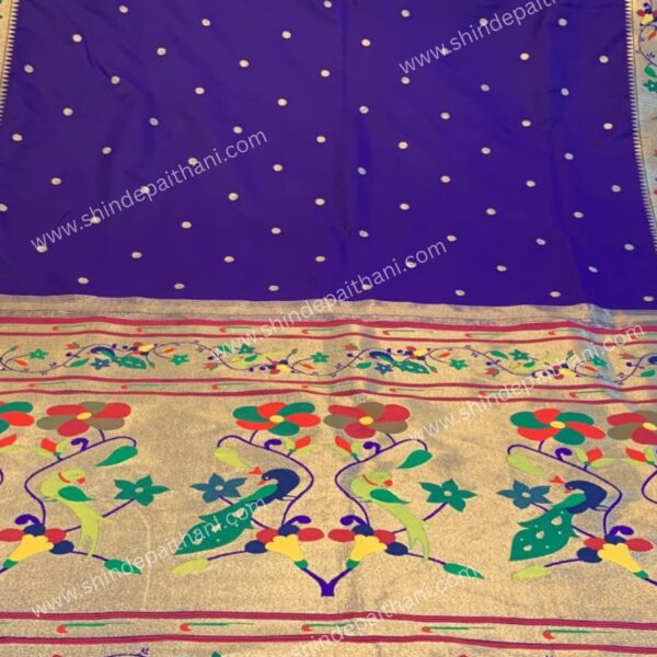Traditional Chandrakor Paithani Silk Saree, Blue and Gold, Peacock Motif Border, Tassels, Zari Work, Wedding Wear