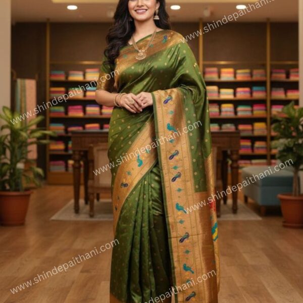 Traditional Banarasi Silk Saree, Olive Green with Gold Border, Peacock Motif Design, Festive Wear