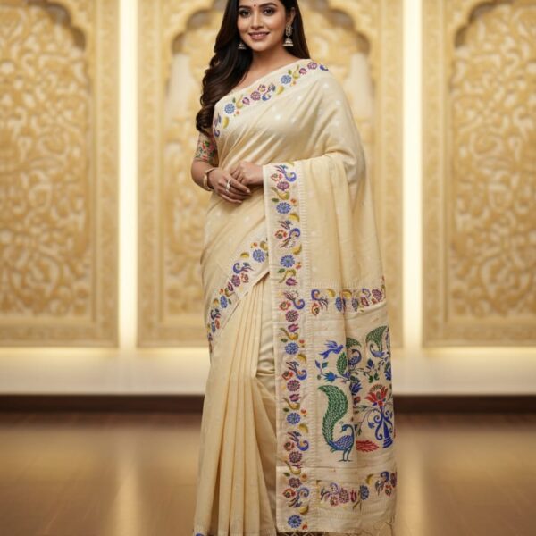 Traditional Cream linen Pure Cotton Semi Paithani Saree with Embroidered Peacock Border, Floral Design, Festive/wedding Wear