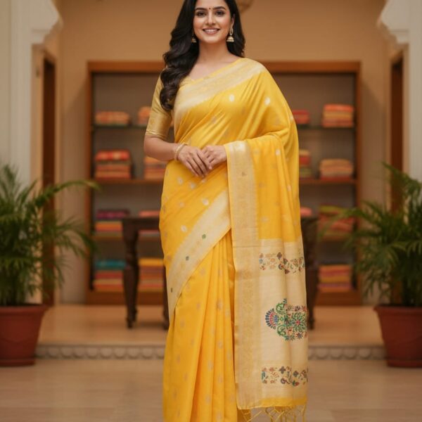 Traditional Yellow Linen Cotton Semi Paithani Saree with Floral Border,Elegant Traditional Pallu Design, Festival/Wedding Wear