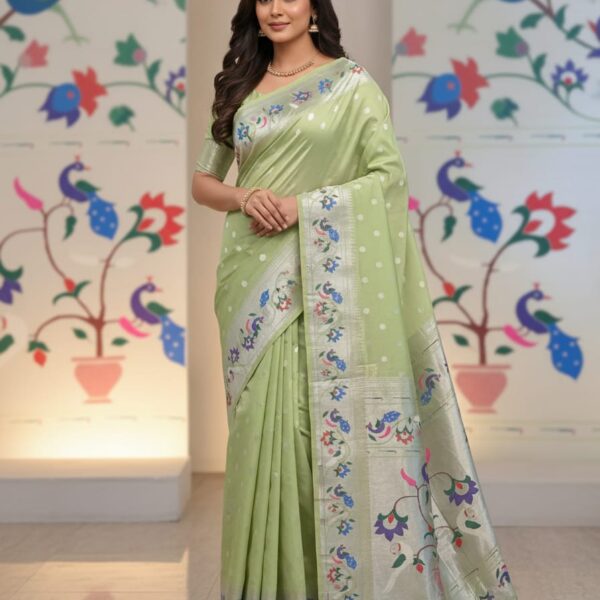 Elegant Light Green Tint Linen Pure Cotton Semi Paithani Saree with Silver Border, Polka Dot Pattern, Floral Embroidered Design, Traditional Wedding Wear