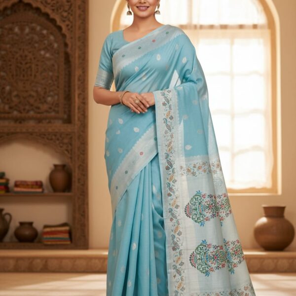 Elegant Sky Blue Linen Pure Cotton Semi Paithani Saree with Floral Border, Traditional Indian Wear, Silver Zari Work, Paithani Pallu Design