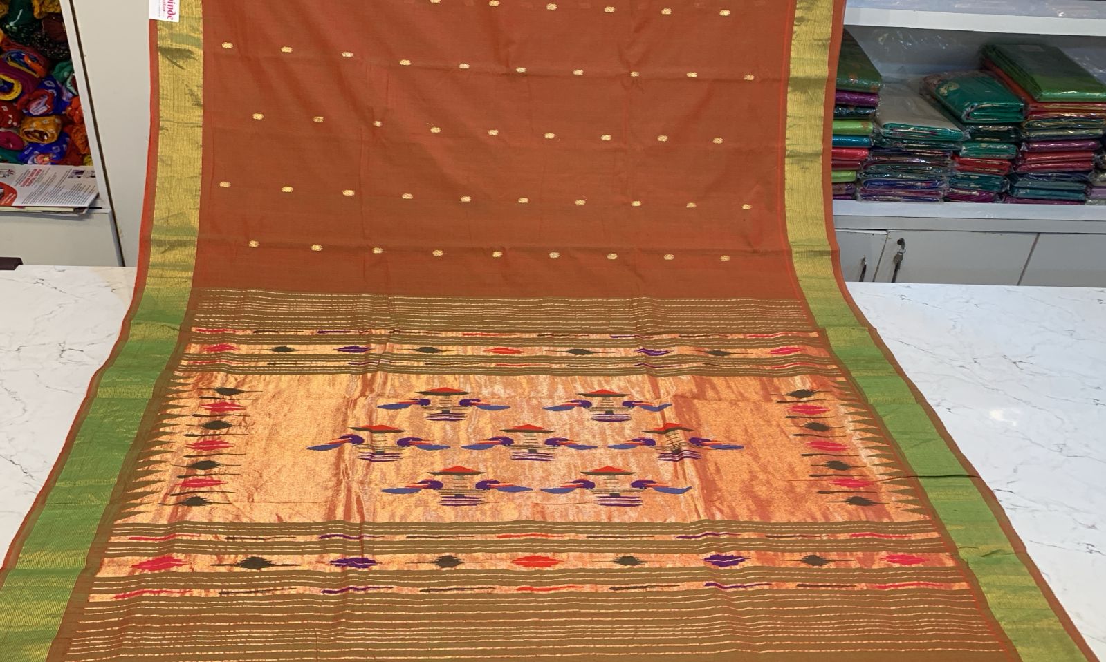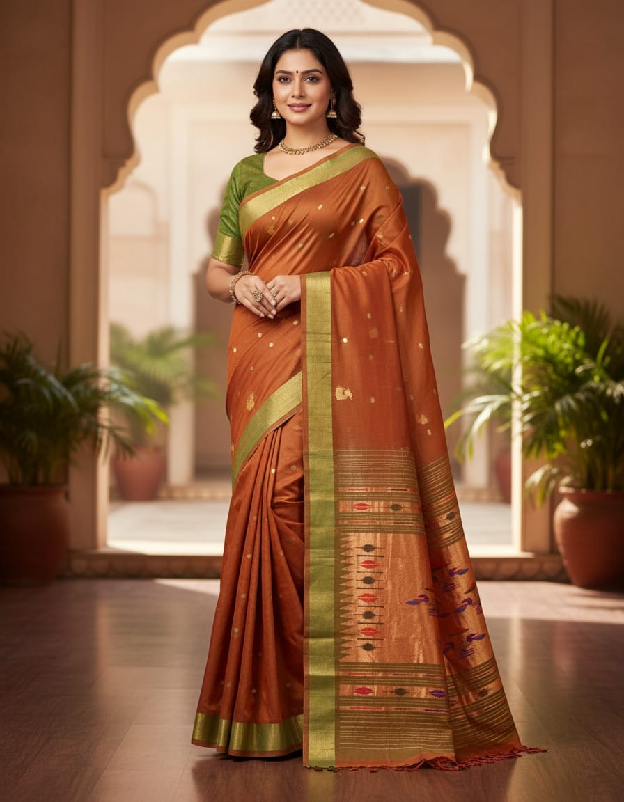 Elevate your festive wardrobe with this exquisite Pure Cotton Paithani Saree in a striking rust orange hue. The saree features a magnificent green border adorned with intricate gold zari work, creating a perfect balance of traditional craftsmanship and contemporary elegance. Handwoven on traditional looms, this handloom saree showcases the rich heritage of Paithani weaving. The pallu features distinctive patterns with meticulous detailing, while small golden motifs are delicately scattered across the body, adding a subtle sparkle. The contrasting green blouse piece complements the border beautifully, making it a stunning ensemble for festivals, ceremonies, and special occasions. The pure cotton fabric ensures comfort and breathability, making it suitable for extended wear. This saree represents the perfect fusion of luxury and tradition, making it an invaluable addition to your ethnic collection. Dry clean recommended to maintain the saree’s pristine condition.