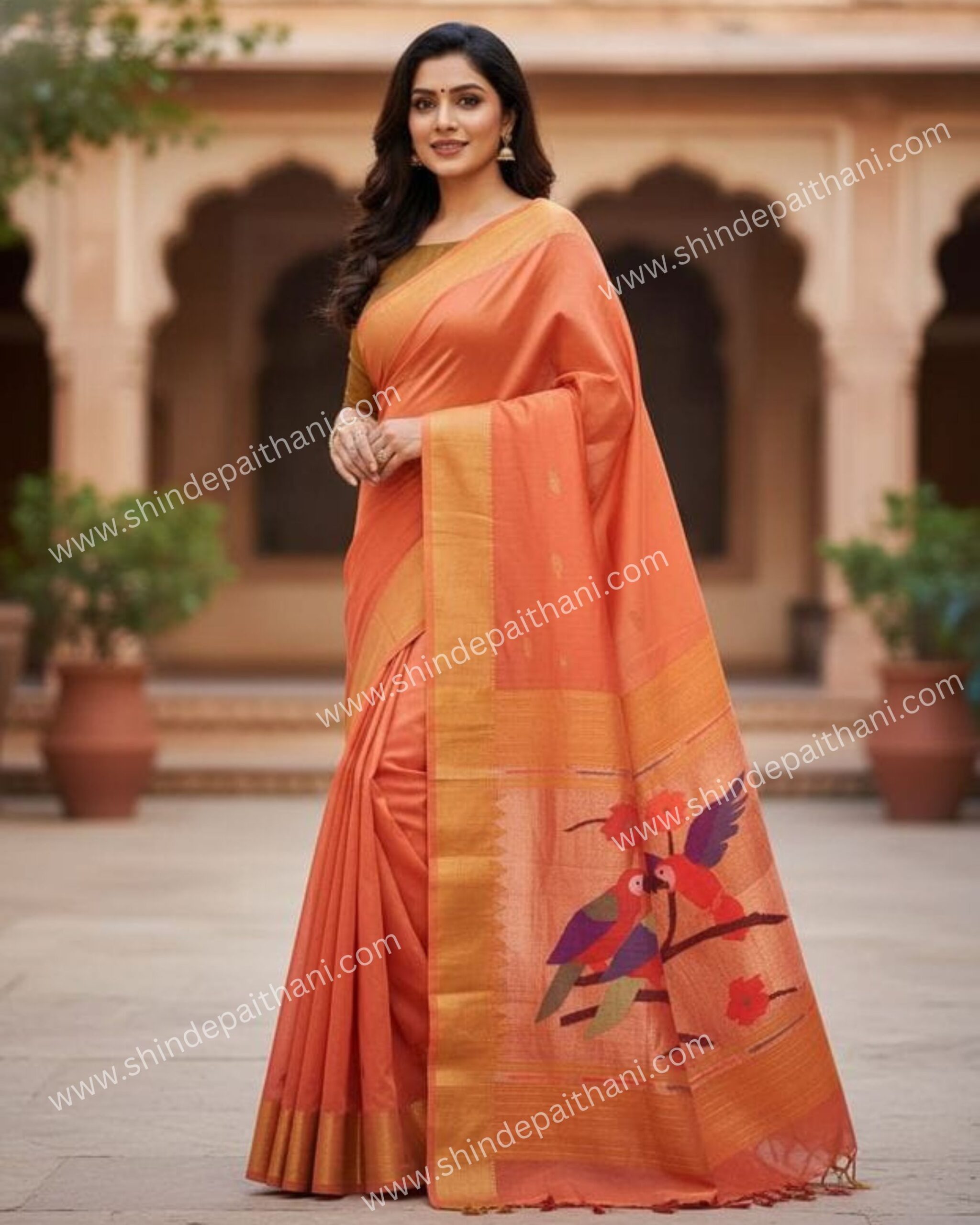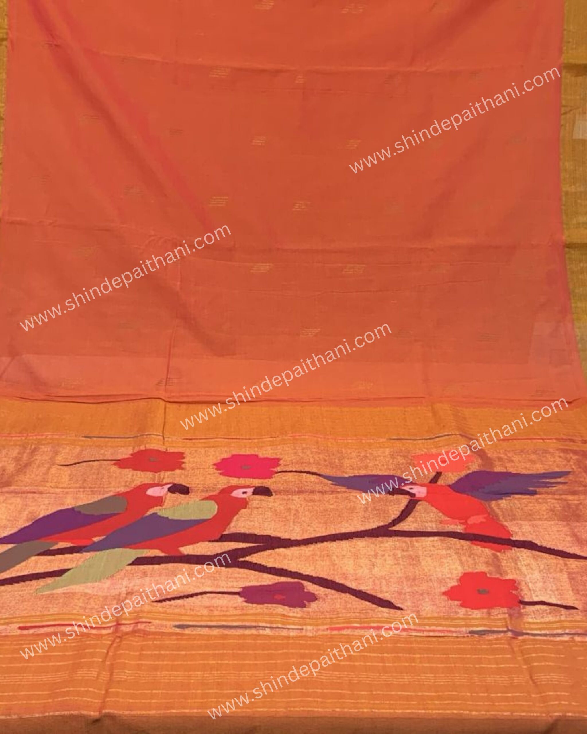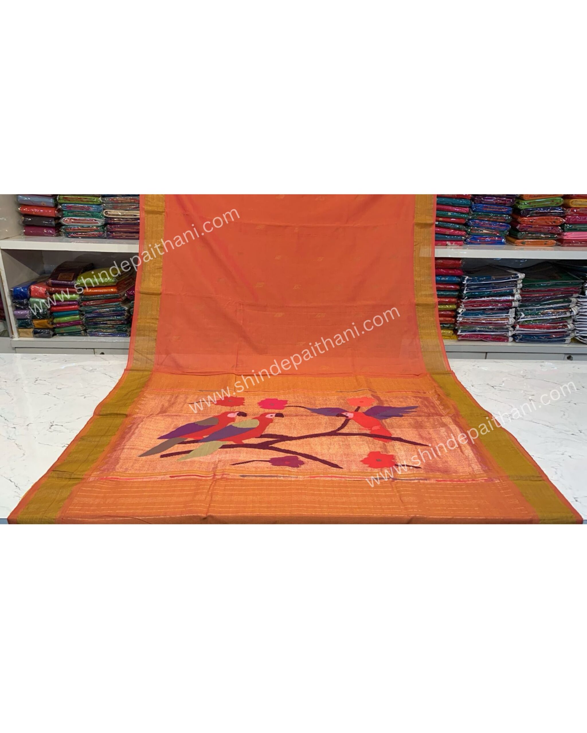 HANDCRAFTED ELEGANCE: Pure cotton saree featuring traditional orange base with luxurious gold border, perfect for ethnic occasions and festivities