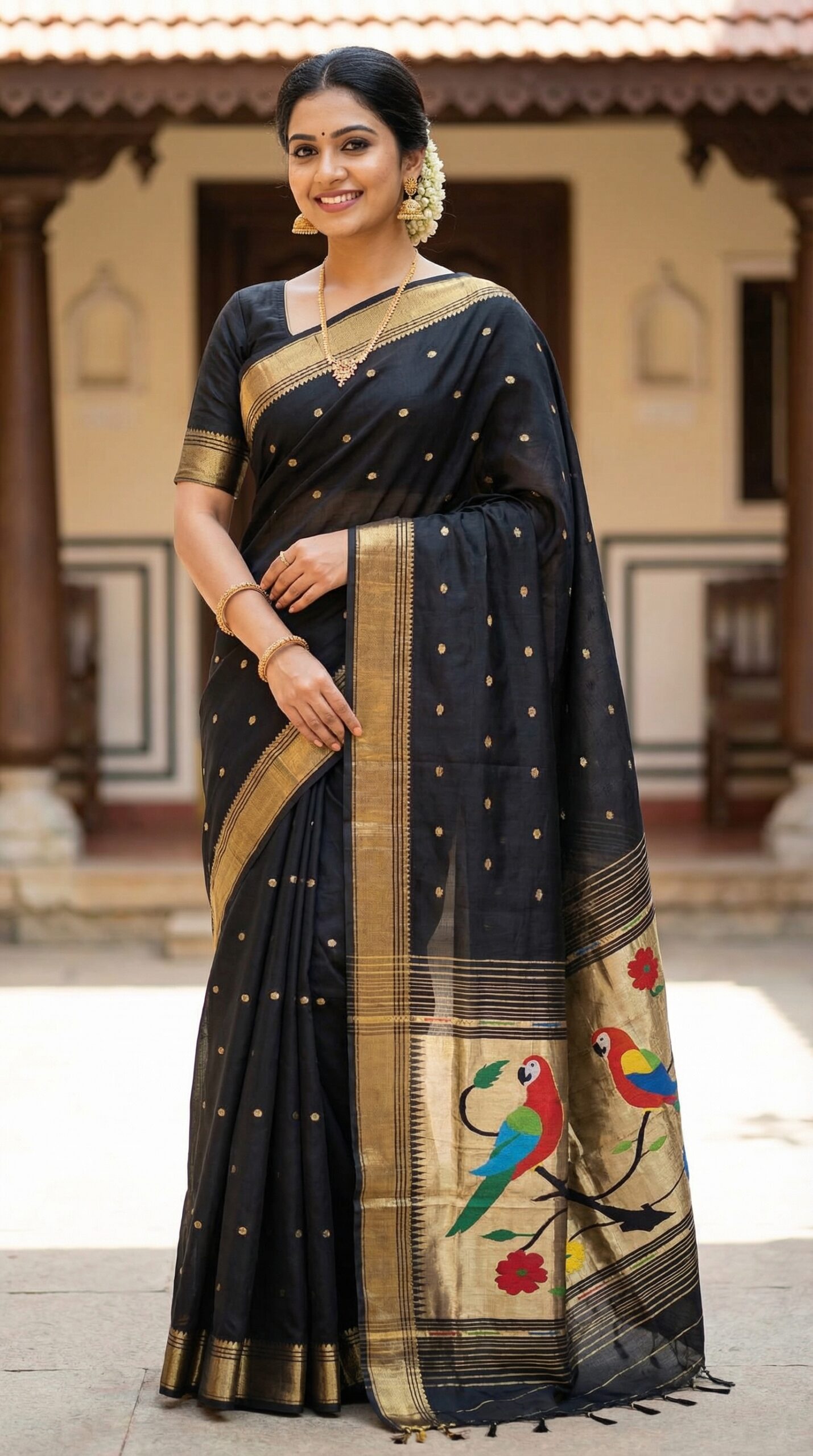 Handwoven Black Pure Cotton Paithani Saree with Traditional Tree Design, Elegant Pallu Border, Festival Wear for Women