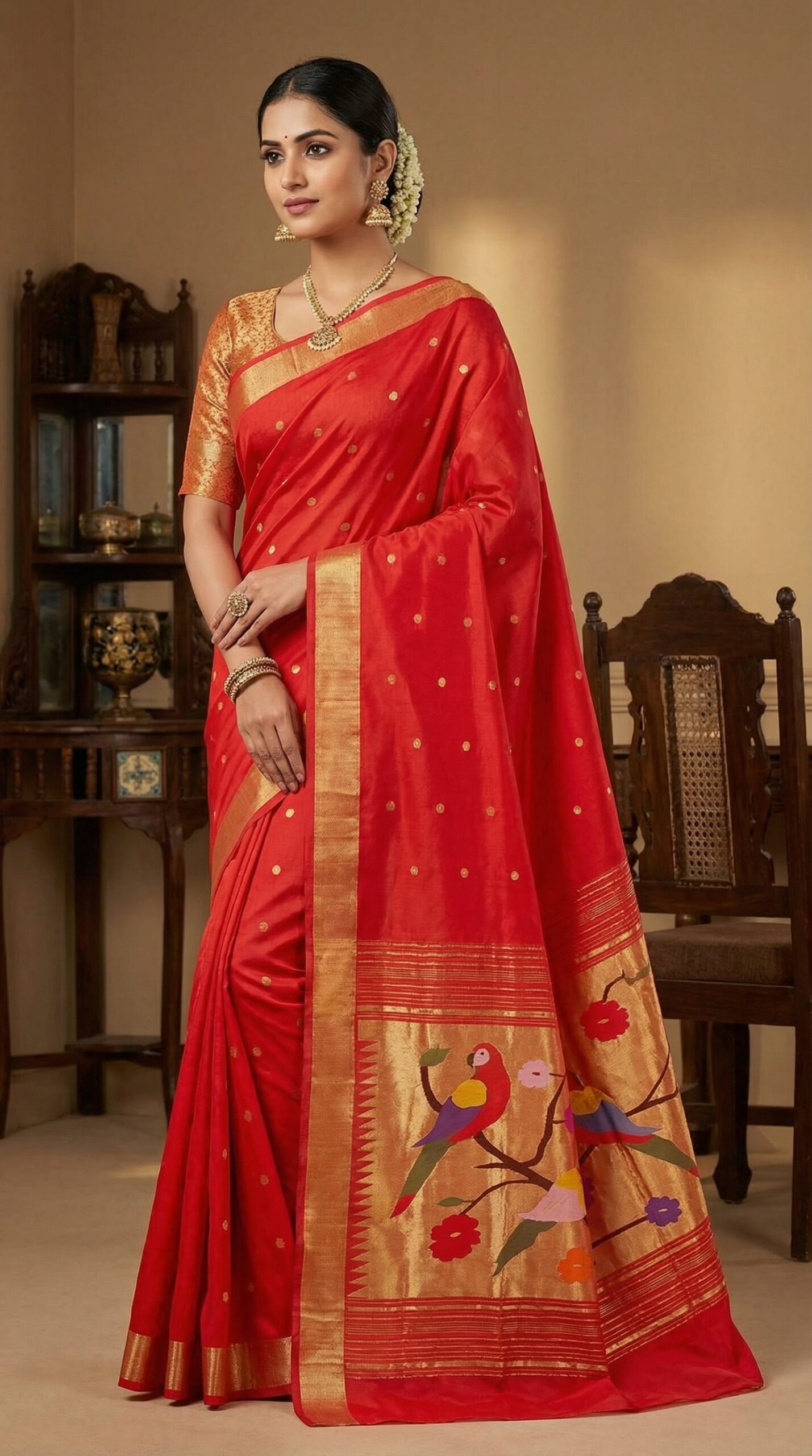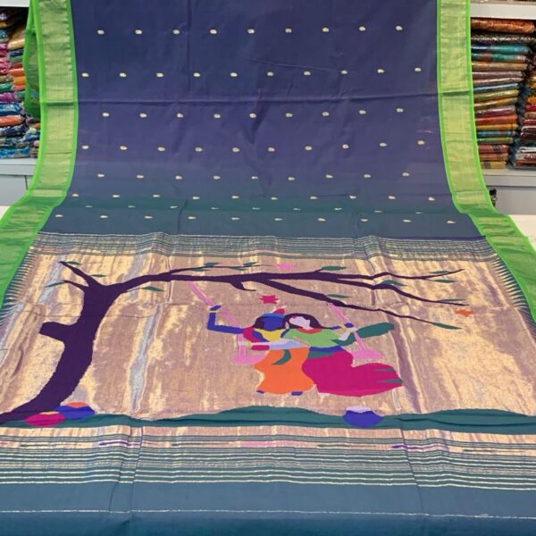 Discover the timeless elegance of this handwoven Pure Cotton Paithani saree in a radiant red hue. The saree showcases exquisite craftsmanship with its traditional tree design motif that adds a distinctive charm to the overall aesthetic. The pallu features an elegant border that exemplifies the rich heritage of Paithani weaving. Perfect for festivals and special occasions, this saree combines classic design elements with contemporary appeal. The pure cotton fabric ensures comfort and breathability, making it suitable for extended wear during celebrations. The saree’s balanced composition of traditional artistry and sophisticated colour makes it a versatile addition to your ethnic wardrobe. The intricate weaving technique employed creates a luxurious drape that enhances the wearer’s grace. This beautiful piece represents the pinnacle of Indian handloom expertise, making it an ideal choice for those who appreciate authentic craftsmanship and cultural significance in their traditional wear.