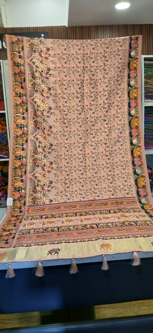 Pashmina Silk Saree with Traditional Madhubani Print, Woven Border