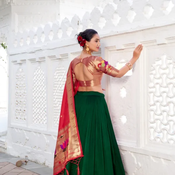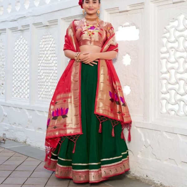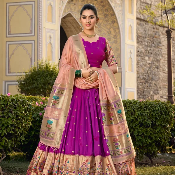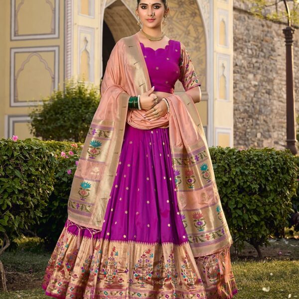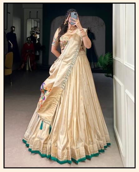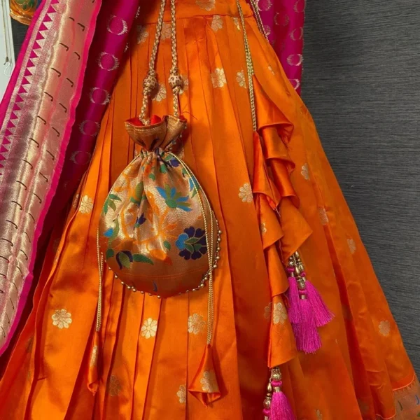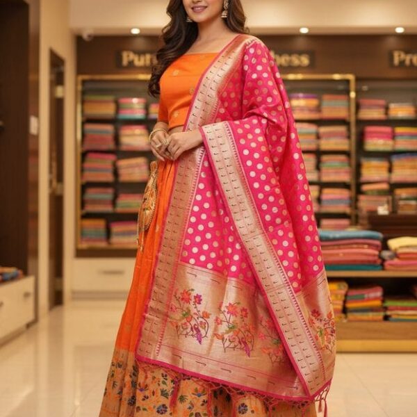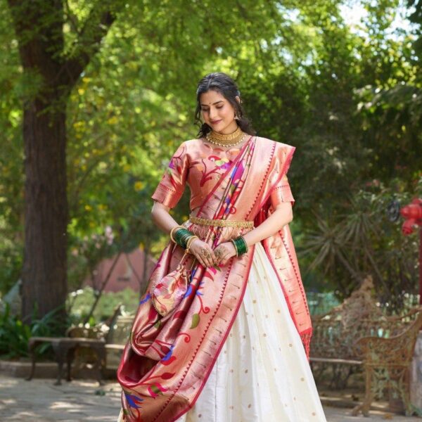 Embrace timeless elegance with this exquisite Paithani Lehenga Choli Set, a masterpiece of traditional Indian craftsmanship. The ensemble features a sophisticated beige crop top adorned with delicate lotus motifs, paired with a flowing white skirt embellished with intricate embroidery work. The skirt’s border showcases a stunning array of floral patterns and artistic designs in vibrant hues, creating a mesmerising visual appeal. The outfit is complemented by a striking orange dupatta with classic Paithani borders featuring metallic accents and elaborate patterns. The combination of silk fabric and detailed craftsmanship makes this set perfect for wedding celebrations and festive occasions. The harmonious blend of traditional elements with contemporary styling ensures you stand out at any special event. The ensemble comes with a matching potli bag, adding a touch of traditional charm to complete your look. This Lehenga Choli Set represents the perfect marriage of heritage artistry and modern fashion sensibilities.